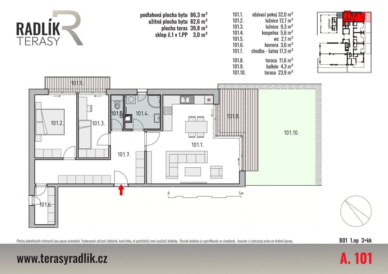 Bytová jednotka s dispozicí 3+kk v 1.NP bytového domu A o celkové podlahové ploše bytu 86,3 m2, k níž náleží výlučné právo užívat terasy a balkon přímo přístupné z bytu v celkové ploše 39,8 m2 a sklep č. 1 o výměře 3 m2 v 1.PP bytového domu. Dispozice bytu zahrnuje obývací pokoj s prostorem pro kuchyňský kout, dvě ložnice, chodbu, koupelnu, samostatné WC a komoru. Užitná plocha bytu (součet ploch všech místností) je 82,6 m2. Uspořádání jednotlivých místností v půdorysu bytu je patrné z katalogového listu. Sklep naleznete na půdorysu 1.PP bytového domu A. Interiér bytové jednotky a exteriér budov si můžete prohlédnout na přiložených ilustrativních vizualizacích, nejlepší představu však samozřejmě získáte při osobní prohlídce přímo na místě.
