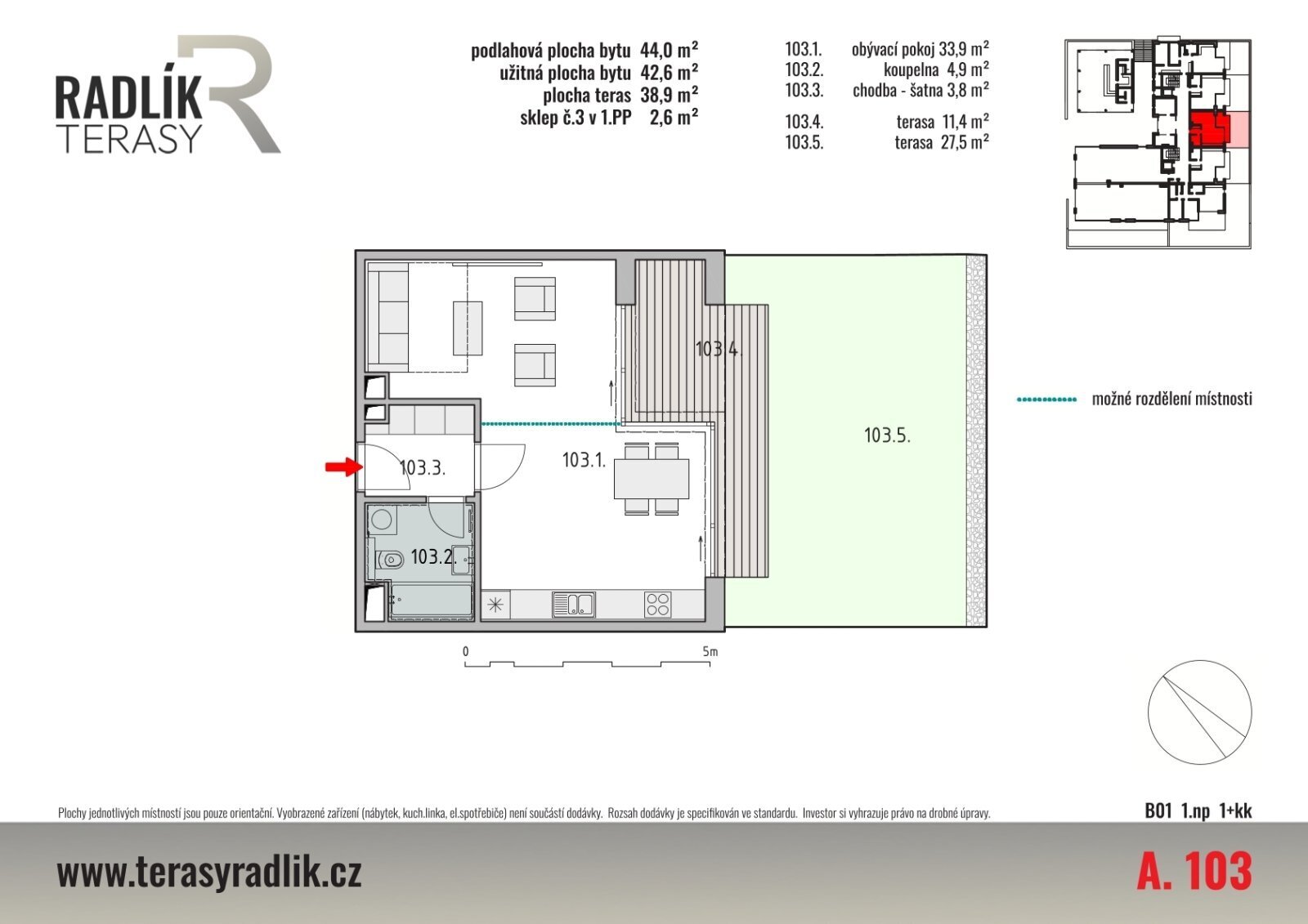 Bytová jednotka s dispozicí 1+kk v 1.NP bytového domu A o celkové podlahové ploše bytu 44,0 m2, k níž náleží výlučné právo užívat terasy přímo přístupné z bytu v celkové ploše 38,9 m2 a sklep č. 3 o výměře 2,6 m2 v 1.PP bytového domu. Dispozice bytu zahrnuje obývací pokoj s prostorem pro kuchyňský kout, chodbu a koupelnu. Užitná plocha bytu (součet ploch všech místností) je 42,6 m2. Uspořádání jednotlivých místností v půdorysu bytu je patrné z katalogového listu. Obytný prostor lze potenciálně stavebně nebo nábytkově rozdělit na 2 místnosti. Sklep naleznete na půdorysu 1.PP bytového domu A. Interiér bytové jednotky a exteriér budov si můžete prohlédnout na přiložených ilustrativních vizualizacích, nejlepší představu však samozřejmě získáte při osobní prohlídce přímo na místě.