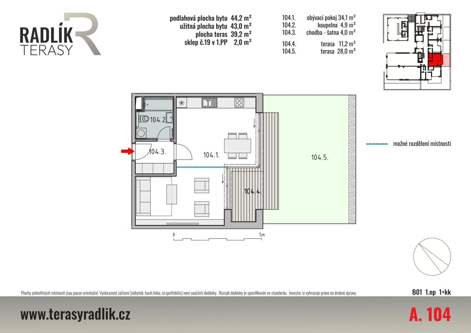 Bytová jednotka s dispozicí 1+kk v 1.NP bytového domu A o celkové podlahové ploše bytu 44,2 m2, k níž náleží výlučné právo užívat terasy přímo přístupné z bytu v celkové ploše 39,2 m2 a sklep č. 19 o výměře 2 m2 v 1.PP bytového domu. Dispozice bytu zahrnuje obývací pokoj s prostorem pro kuchyňský kout, chodbu a koupelnu. Užitná plocha bytu (součet ploch všech místností) je 43 m2. Uspořádání jednotlivých místností v půdorysu bytu je patrné z katalogového listu. Obytný prostor lze potenciálně stavebně nebo nábytkově rozdělit na 2 místnosti. Sklep naleznete na půdorysu 1.PP bytového domu A. Interiér bytové jednotky a exteriér budov si můžete prohlédnout na přiložených ilustrativních vizualizacích, nejlepší představu však samozřejmě získáte při osobní prohlídce přímo na místě.