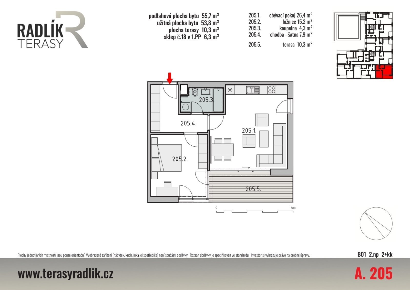 Bytová jednotka s dispozicí 2+kk ve 2.NP bytového domu A o celkové podlahové ploše bytu 55,7 m2, k níž náleží výlučné právo užívat terasu přímo přístupnou z bytu v ploše 10,3 m2 a sklep č. 18 o velikosti 6,3 m2 v 1.PP bytového domu. Dispozice bytu zahrnuje obývací pokoj s prostorem pro kuchyňský kout, ložnici, chodbu a koupelnu. Užitná plocha bytu (součet ploch všech místností) je 53,8 m2. Uspořádání jednotlivých místností v půdorysu bytu je patrné z katalogového listu. Sklep naleznete na půdorysu 1.PP bytového domu A. Interiér bytové jednotky a exteriér budov si můžete prohlédnout na přiložených ilustrativních vizualizacích, nejlepší představu však samozřejmě získáte při osobní prohlídce přímo na místě.
