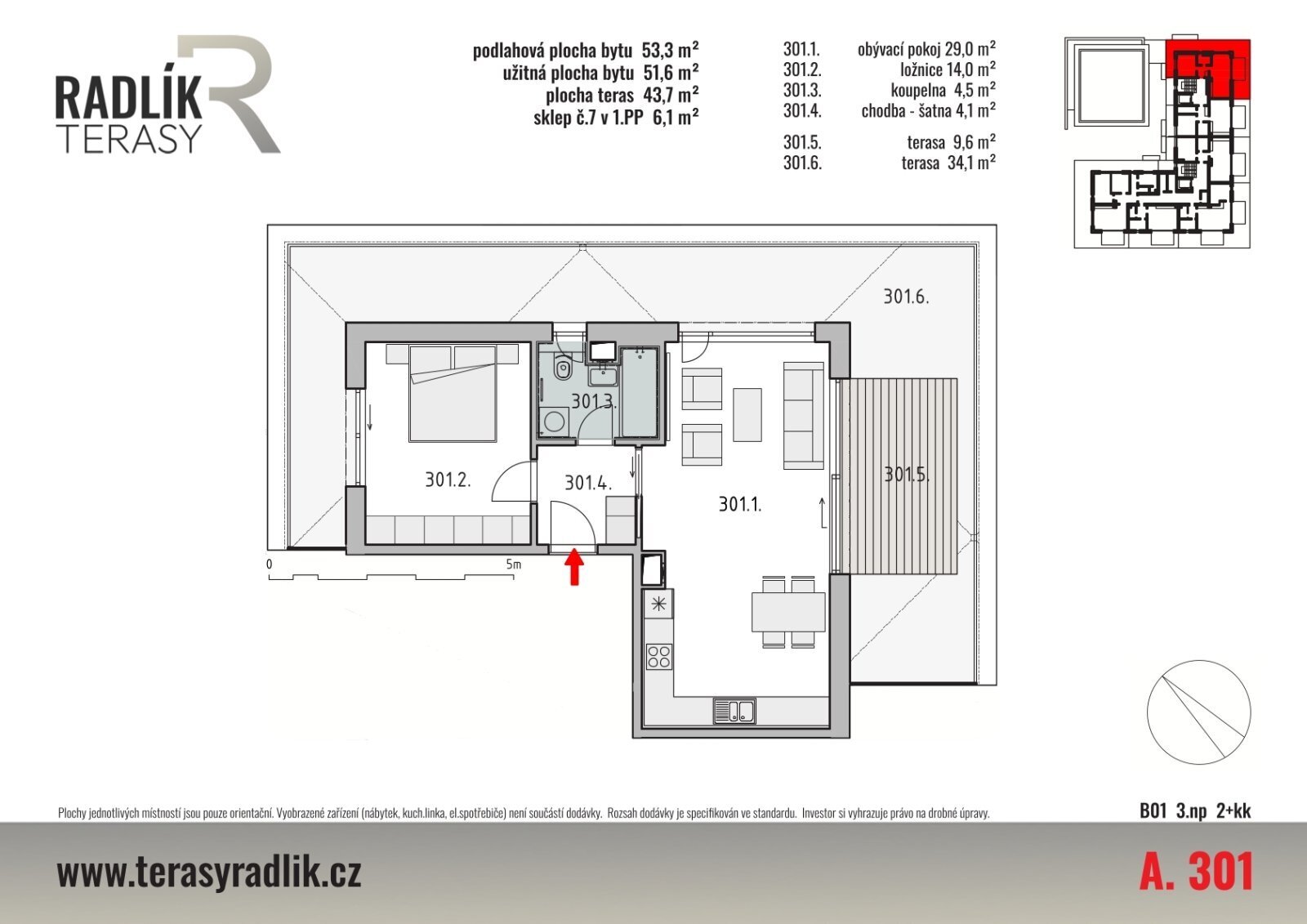 Bytová jednotka s dispozicí 2+kk ve 3.NP bytového domu A o celkové podlahové ploše bytu 53,3 m2, k níž náleží výlučné právo užívat terasy přímo přístupné z bytu v celkové ploše 43,7 m2 a sklep č. 7 o velikosti 6,1 m2 v 1.PP bytového domu. Dispozice bytu zahrnuje obývací pokoj s prostorem pro kuchyňský kout, ložnici, chodbu a koupelnu. Užitná plocha bytu (součet ploch všech místností) je 51,6 m2. Uspořádání jednotlivých místností v půdorysu bytu je patrné z katalogového listu. Sklep naleznete na půdorysu 1.PP bytového domu A. Interiér bytové jednotky a exteriér budov si můžete prohlédnout na přiložených ilustrativních vizualizacích, nejlepší představu však samozřejmě získáte při osobní prohlídce přímo na místě.