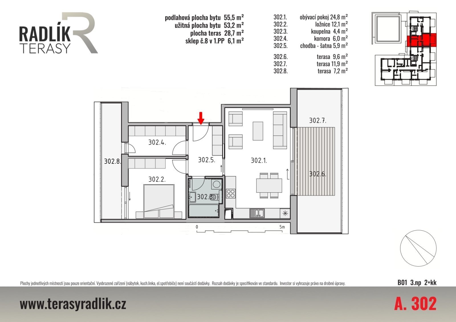 Bytová jednotka s dispozicí 2+kk ve 3.NP bytového domu A o celkové podlahové ploše bytu 55,5 m2, k níž náleží výlučné právo užívat terasy přímo přístupné z bytu v celkové ploše 28,7 m2 a sklep č. 8 o velikosti 6,1 m2 v 1.PP bytového domu. Dispozice bytu zahrnuje obývací pokoj s prostorem pro kuchyňský kout, ložnici, chodbu, koupelnu a komoru. Užitná plocha bytu (součet ploch všech místností) je 53,2 m2. Uspořádání jednotlivých místností v půdorysu bytu je patrné z katalogového listu. Sklep naleznete na půdorysu 1.PP bytového domu A. Interiér bytové jednotky a exteriér budov si můžete prohlédnout na přiložených ilustrativních vizualizacích, nejlepší představu však samozřejmě získáte při osobní prohlídce přímo na místě.