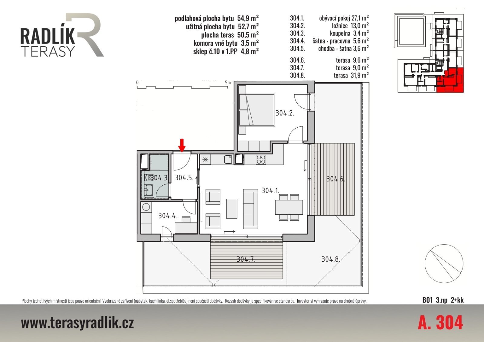 Bytová jednotka s dispozicí 2+kk ve 3.NP bytového domu A o celkové podlahové ploše bytu 54,9 m2, k níž náleží výlučné právo užívat terasy přímo přístupné z bytu v celkové ploše 50,5 m2, sklep č. 10 o velikosti 4,8 m2 v 1.PP bytového domu a komoru vně bytu (na stejném podlaží jako byt) o výměře 3,5 m2. Dispozice bytu zahrnuje obývací pokoj s prostorem pro kuchyňský kout, ložnici, chodbu, koupelnu a šatnu/pracovnu. Užitná plocha bytu (součet ploch všech místností) je 52,7 m2. Uspořádání jednotlivých místností v půdorysu bytu je patrné z katalogového listu, stejně jako umístění samostatné komory v rámci podlaží. Sklep naleznete na půdorysu 1.PP bytového domu A. Interiér bytové jednotky a exteriér budov si můžete prohlédnout na přiložených ilustrativních vizualizacích, nejlepší představu však samozřejmě získáte při osobní prohlídce přímo na místě.