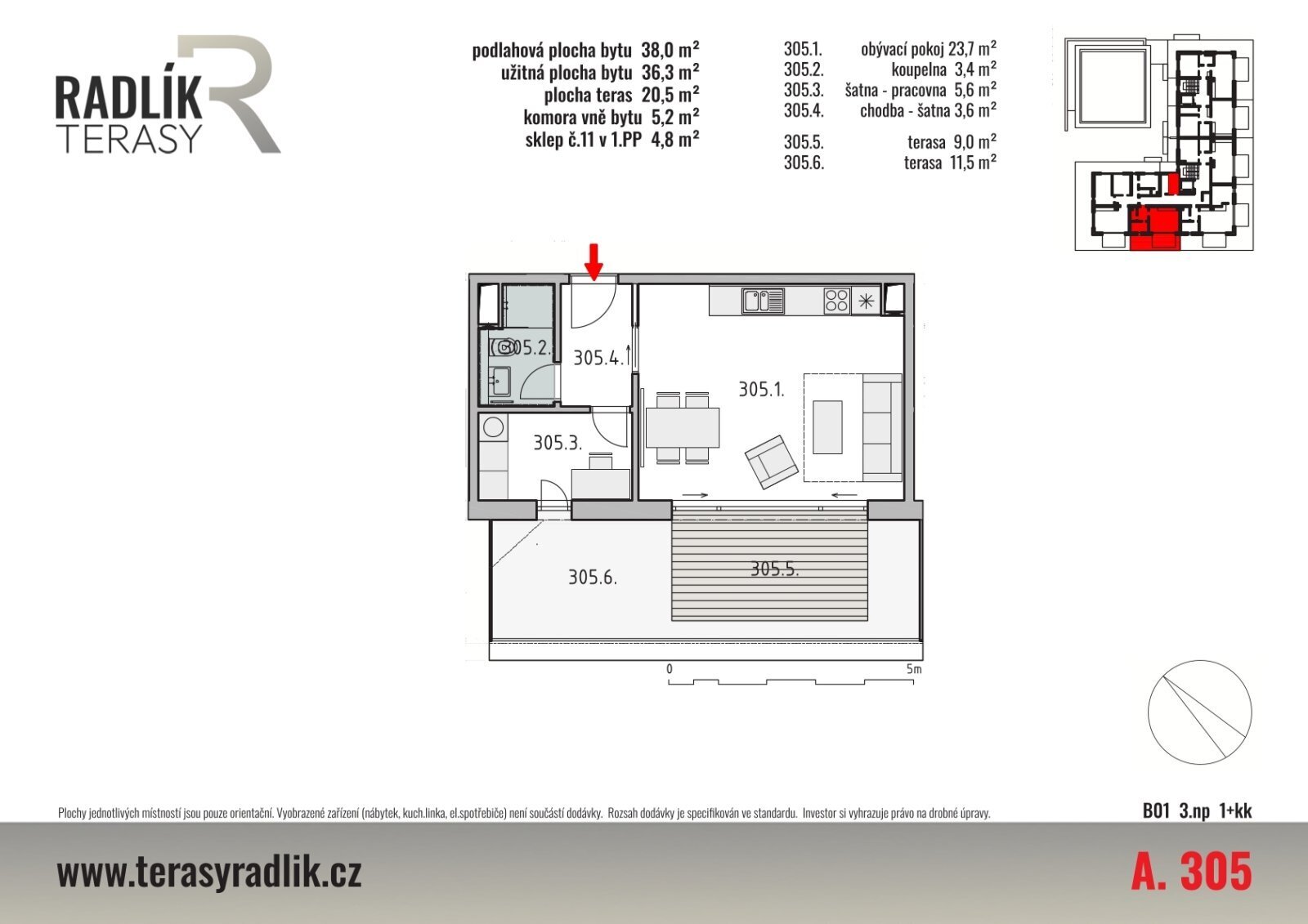 Bytová jednotka s dispozicí 1+kk ve 3.NP bytového domu A o celkové podlahové ploše bytu 38,0 m2, k níž náleží výlučné právo užívat terasy přímo přístupné z bytu v celkové ploše 20,5 m2, sklep č. 11 o velikosti 4,8 m2 v 1.PP bytového domu a komoru vně bytu (na stejném podlaží jako byt) o výměře 5,2 m2. Dispozice bytu zahrnuje obývací pokoj s prostorem pro kuchyňský kout, chodbu, koupelnu a šatnu/pracovnu. Užitná plocha bytu (součet ploch všech místností) je 36,3 m2. Uspořádání jednotlivých místností v půdorysu bytu je patrné z katalogového listu. Sklep naleznete na půdorysu 1.PP bytového domu A. Interiér bytové jednotky a exteriér budov si můžete prohlédnout na přiložených ilustrativních vizualizacích, nejlepší představu však samozřejmě získáte při osobní prohlídce přímo na místě.