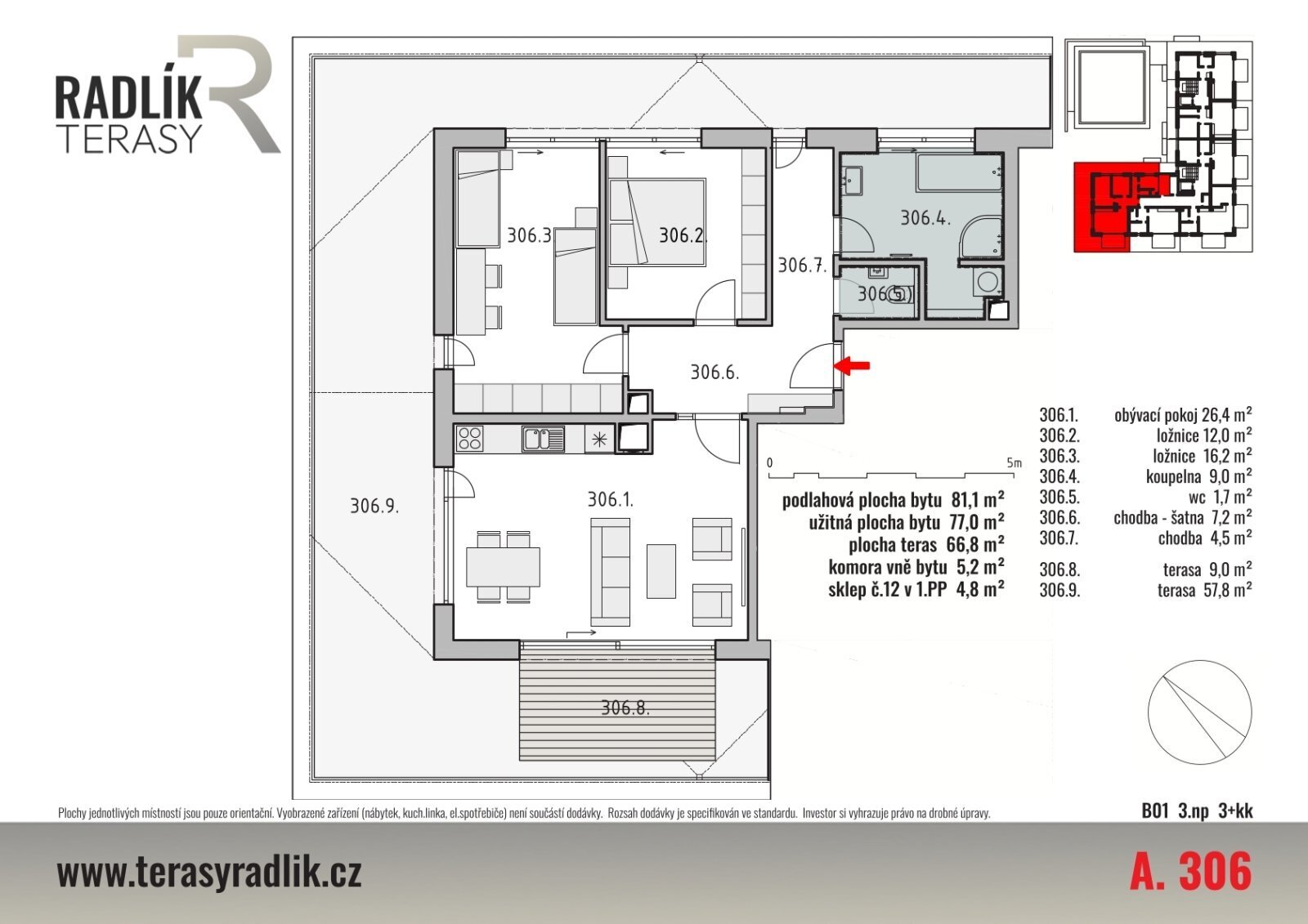 Bytová jednotka s dispozicí 3+kk ve 3.NP bytového domu A o celkové podlahové ploše bytu 81,1 m2, k níž náleží výlučné právo užívat terasy přímo přístupné z bytu v celkové ploše 66,8 m2, sklep č. 12 o velikosti 4,8 m2 v 1.PP bytového domu a komoru vně bytu (na stejném podlaží jako byt) o výměře 5,2 m2. Dispozice bytu zahrnuje obývací pokoj s prostorem pro kuchyňský kout, dvě ložnice, chodbu, koupelnu a samostatné WC. Užitná plocha bytu (součet ploch všech místností) je 77,0 m2. Uspořádání jednotlivých místností v půdorysu bytu je patrné z katalogového listu, stejně jako umístění samostatné komory v rámci podlaží. Sklep naleznete na půdorysu 1.PP bytového domu A. Interiér bytové jednotky a exteriér budov si můžete prohlédnout na přiložených ilustrativních vizualizacích, nejlepší představu však samozřejmě získáte při osobní prohlídce přímo na místě.