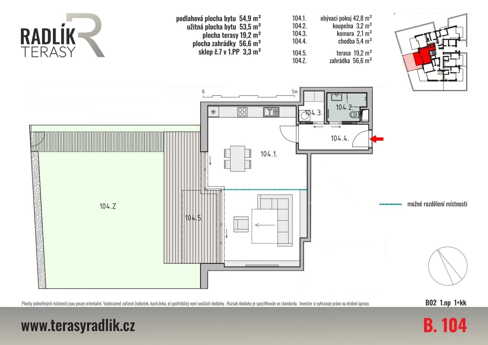 Bytová jednotka s dispozicí 1+kk v 1.NP bytového domu B o celkové podlahové ploše bytu 54,9 m2, k níž náleží výlučné právo užívat terasu přímo přístupnou z bytu o ploše 19,2 m2, zahrádku o výměře 56,6 m2 a sklep č. 7 o výměře 3,3 m2 v 1.PP bytového domu. Dispozice bytu zahrnuje obývací pokoj s prostorem pro kuchyňský kout, chodbu, koupelnu a komoru. Užitná plocha bytu (součet ploch všech místností) je 53,5 m2. Uspořádání jednotlivých místností v půdorysu bytu je patrné z katalogového listu. Obytný prostor lze případně stavebně nebo nábytkově rozdělit na 2 místnosti. Sklep naleznete na půdorysu 1.PP bytového domu B. Interiér bytové jednotky a exteriér budov si můžete prohlédnout na přiložených ilustrativních vizualizacích, nejlepší představu však samozřejmě získáte při osobní prohlídce přímo na místě.