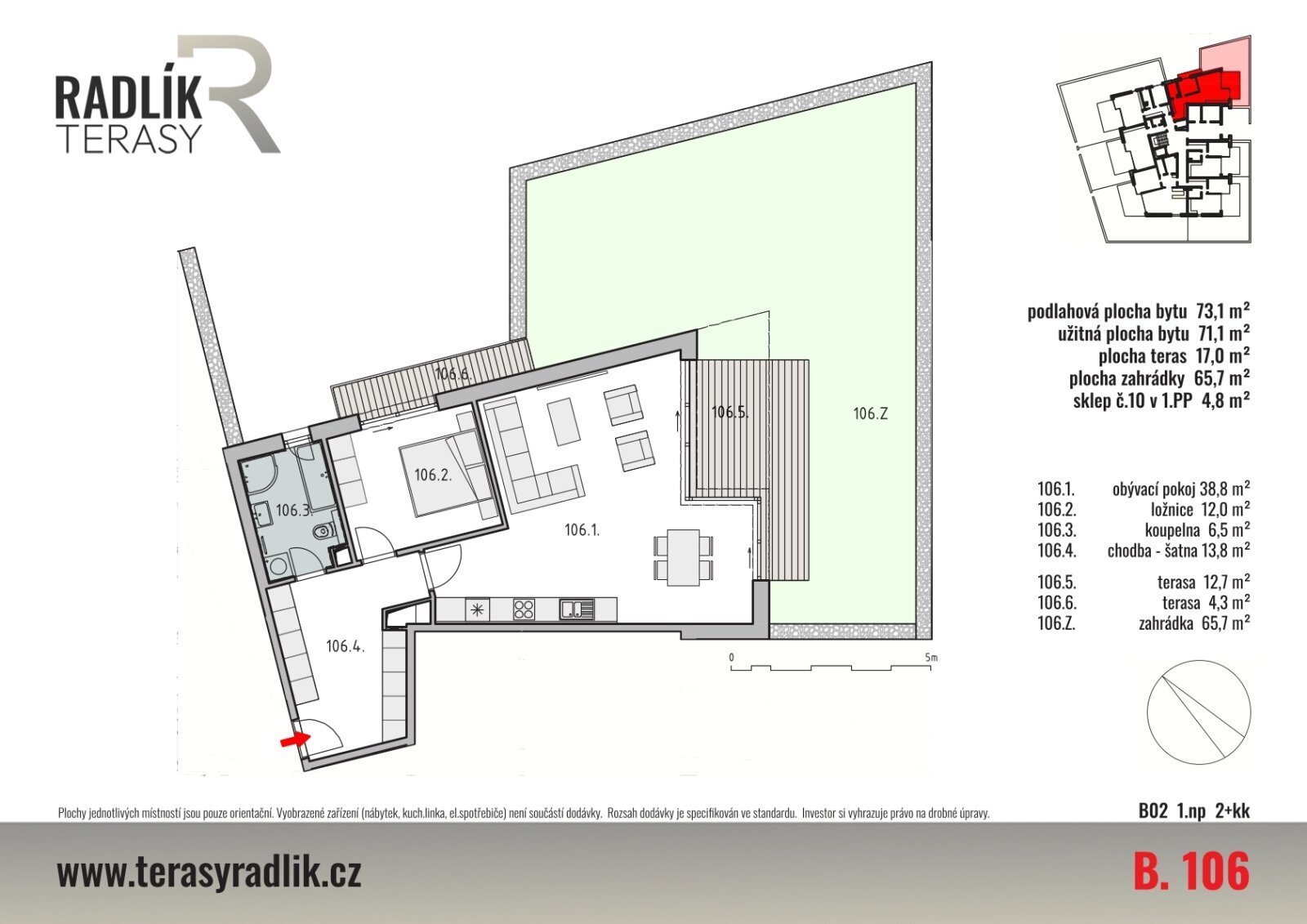 Bytová jednotka s dispozicí 2+kk v 1.NP bytového domu B o celkové podlahové ploše bytu 73,1 m2, k níž náleží výlučné právo užívat terasu přímo přístupnou z bytu o ploše 17 m2, zahrádku o výměře 65,7 m2 a sklep č. 10 o velikosti 4,8 m2 v 1.PP bytového domu. Dispozice bytu zahrnuje obývací pokoj s prostorem pro kuchyňský kout, ložnici, chodbu a koupelnu. Užitná plocha bytu (součet ploch všech místností) je 71,1 m2. Uspořádání jednotlivých místností v půdorysu bytu je patrné z katalogového listu. Sklep naleznete na půdorysu 1.PP bytového domu B. Interiér bytové jednotky a exteriér budov si můžete prohlédnout na přiložených ilustrativních vizualizacích, nejlepší představu však samozřejmě získáte při osobní prohlídce přímo na místě.