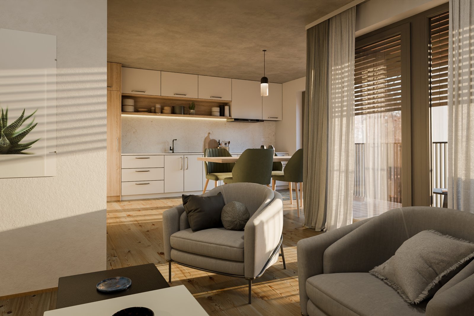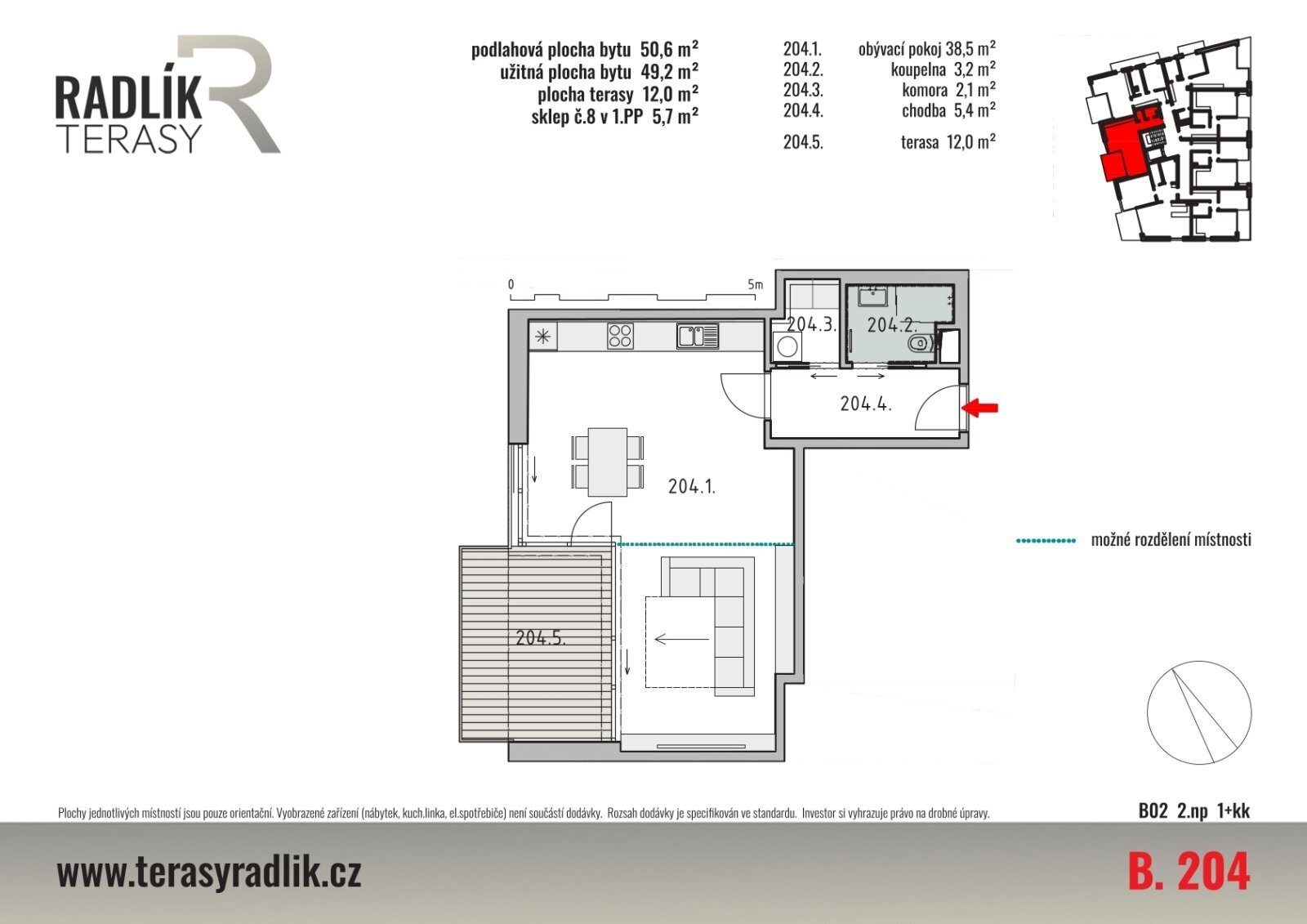 Bytová jednotka s dispozicí 1+kk ve 2.NP bytového domu B o celkové podlahové ploše bytu 50,6 m2, k níž náleží výlučné právo užívat terasu přímo přístupnou z bytu o ploše 12 m2 a sklep č. 8 o výměře 5,7 m2 v 1.PP bytového domu. Dispozice bytu zahrnuje obývací pokoj s prostorem pro kuchyňský kout, chodbu, koupelnu a komoru. Užitná plocha bytu (součet ploch všech místností) je 49,2 m2. Uspořádání jednotlivých místností v půdorysu bytu je patrné z katalogového listu. Obytný prostor lze případně stavebně nebo nábytkově rozdělit na 2 místnosti. Sklep naleznete na půdorysu 1.PP bytového domu B. Interiér bytové jednotky a exteriér budov si můžete prohlédnout na přiložených ilustrativních vizualizacích, nejlepší představu však samozřejmě získáte při osobní prohlídce přímo na místě.