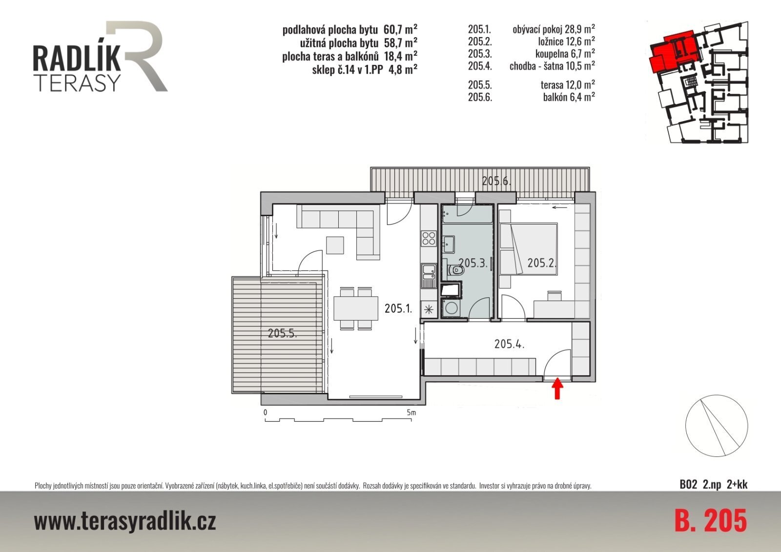 Bytová jednotka s dispozicí 2+kk ve 2.NP bytového domu B o celkové podlahové ploše bytu 60,7 m2, k níž náleží výlučné právo užívat terasu a balkón přímo přístupné z bytu o celkové ploše 18,4 m2 a sklep č. 14 o velikosti 4,8 m2 v 1.PP bytového domu. Dispozice bytu zahrnuje obývací pokoj s prostorem pro kuchyňský kout, ložnici, chodbu a koupelnu. Užitná plocha bytu (součet ploch všech místností) je 58,7 m2. Uspořádání jednotlivých místností v půdorysu bytu je patrné z katalogového listu. Sklep naleznete na půdorysu 1.PP bytového domu B. Interiér bytové jednotky a exteriér budov si můžete prohlédnout na přiložených ilustrativních vizualizacích, nejlepší představu však samozřejmě získáte při osobní prohlídce přímo na místě.