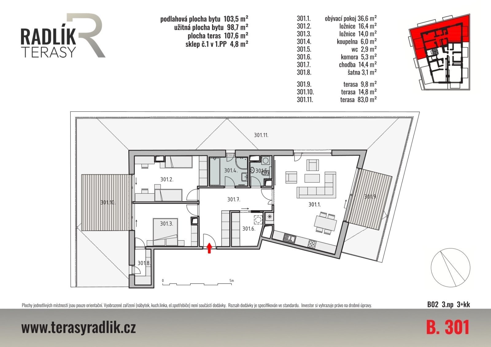 Bytová jednotka s dispozicí 3+kk ve 3.NP bytového domu B o celkové podlahové ploše bytu 103,5 m2, k níž náleží výlučné právo užívat terasy přímo přístupné z bytu o celkové ploše 107,6 m2 a sklep č. 1 o velikosti 4,8 m2 v 1.PP bytového domu. Dispozice bytu zahrnuje obývací pokoj s prostorem pro kuchyňský kout, 2 ložnice, chodbu, koupelnu, samostatné WC, komoru a šatnu. Užitná plocha bytu (součet ploch všech místností) je 98,7 m2. Uspořádání jednotlivých místností v půdorysu bytu je patrné z katalogového listu. Sklep naleznete na půdorysu 1.PP bytového domu B. Interiér bytové jednotky a exteriér budov si můžete prohlédnout na přiložených ilustrativních vizualizacích, nejlepší představu však samozřejmě získáte při osobní prohlídce přímo na místě.